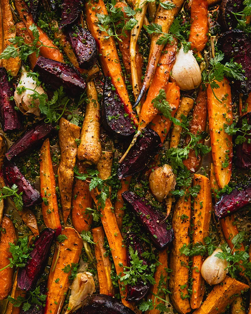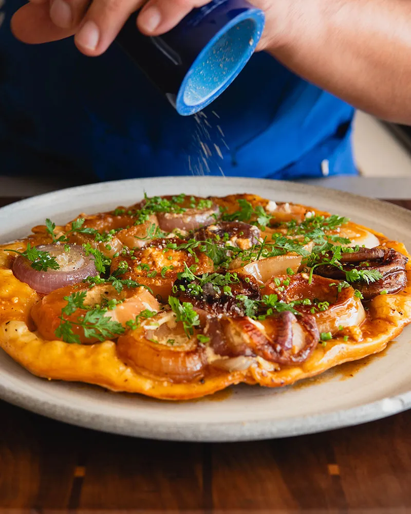 Tarte Tatin salée aux oignons, pommes & fromage de fermeLégumes racines rôtis au miel de cannabis, fleurs fraîches & herbes