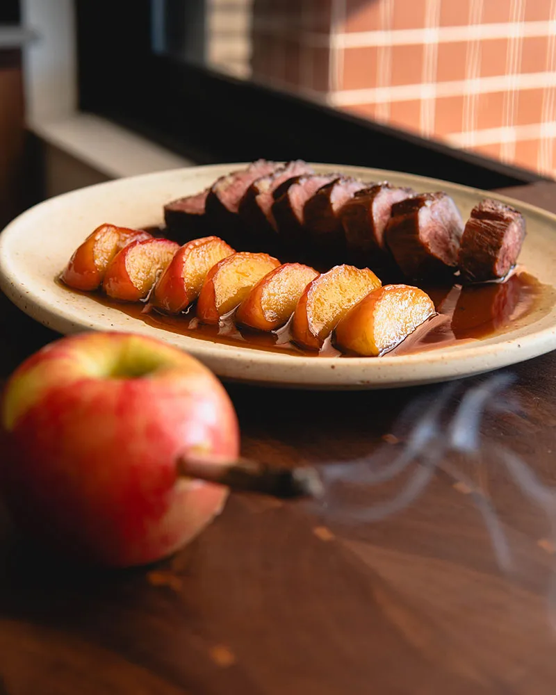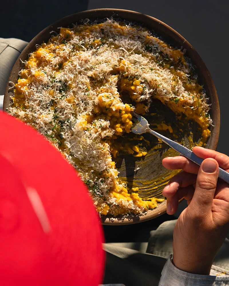 Magret de canard croustillant, gastrique pomme & CalvadosRisotto d’automne au potiron, huile d’olive au cannabis & fleurs de courge